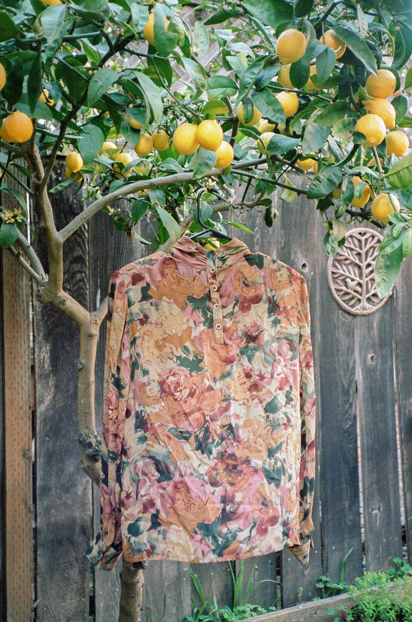 Adaptable: able to adjust to new conditions. Seasonal changes, career moves, skipping across the spacetime continuum? Meet 100% silk floral turtleneck shoulder-padded blouse in earth tones by Carlisle. Pairs with boardrooms and bike shorts in equal measure.